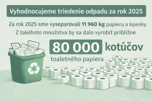 V obci Župkov práve vyhodnocujeme úroveň triedenia odpadu za rok 2025. Vyseparovali sme 11 960 kg papiera a lepenky, čo predstavuje 80 000 kotúčov toaletného papiera, teda približne 98 kotúčov na obyvateľa.